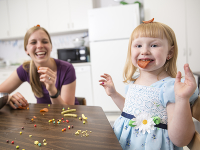Third, pick foods that are very preferred and really easy for your child to eat. Meat and bread sandwiches are actually very time consuming to eat and most children won’t finish them. Raw vegetables like baby carrots or fruits with peels on them are some of the most difficult foods for children to eat from an oral motor standpoint. Try these ideas below instead: